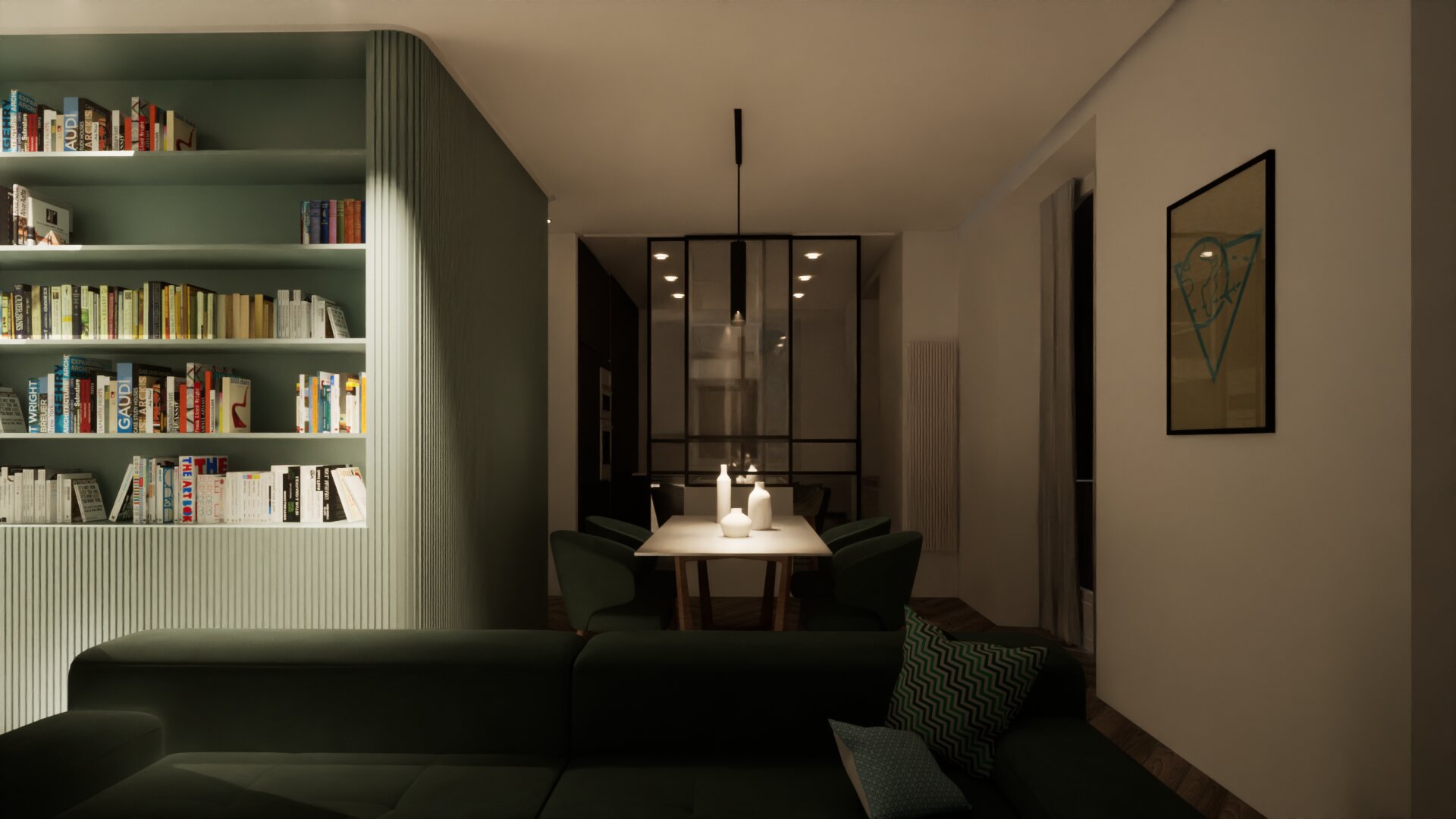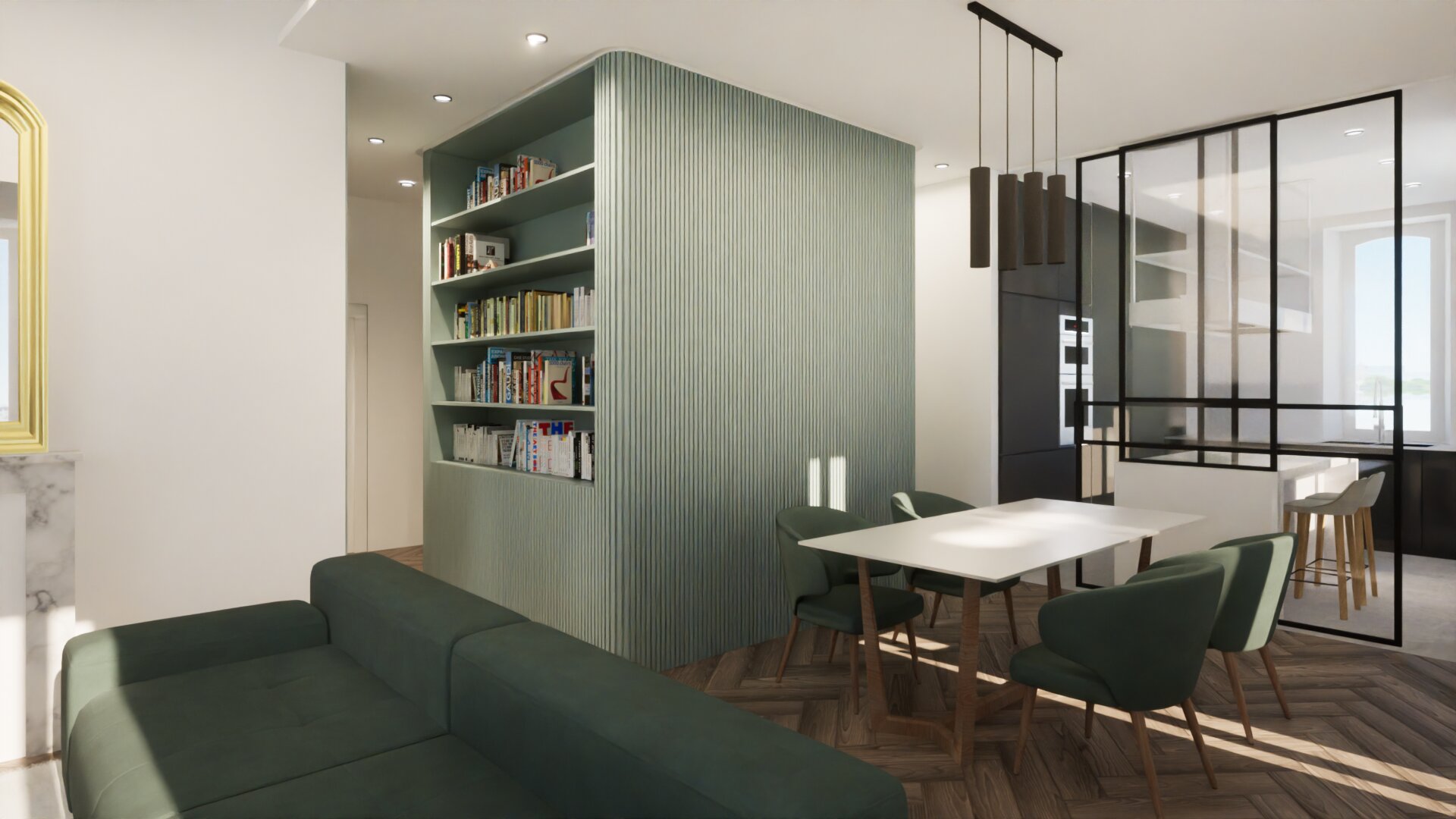 Il progetto di ristutturazione dell’appartamento prevede una nuova ripartizione degli spazi interni. La zona giorno è divisa dalla cucina da una parete vetrata scorrevole, su cui si innesta l’isola.