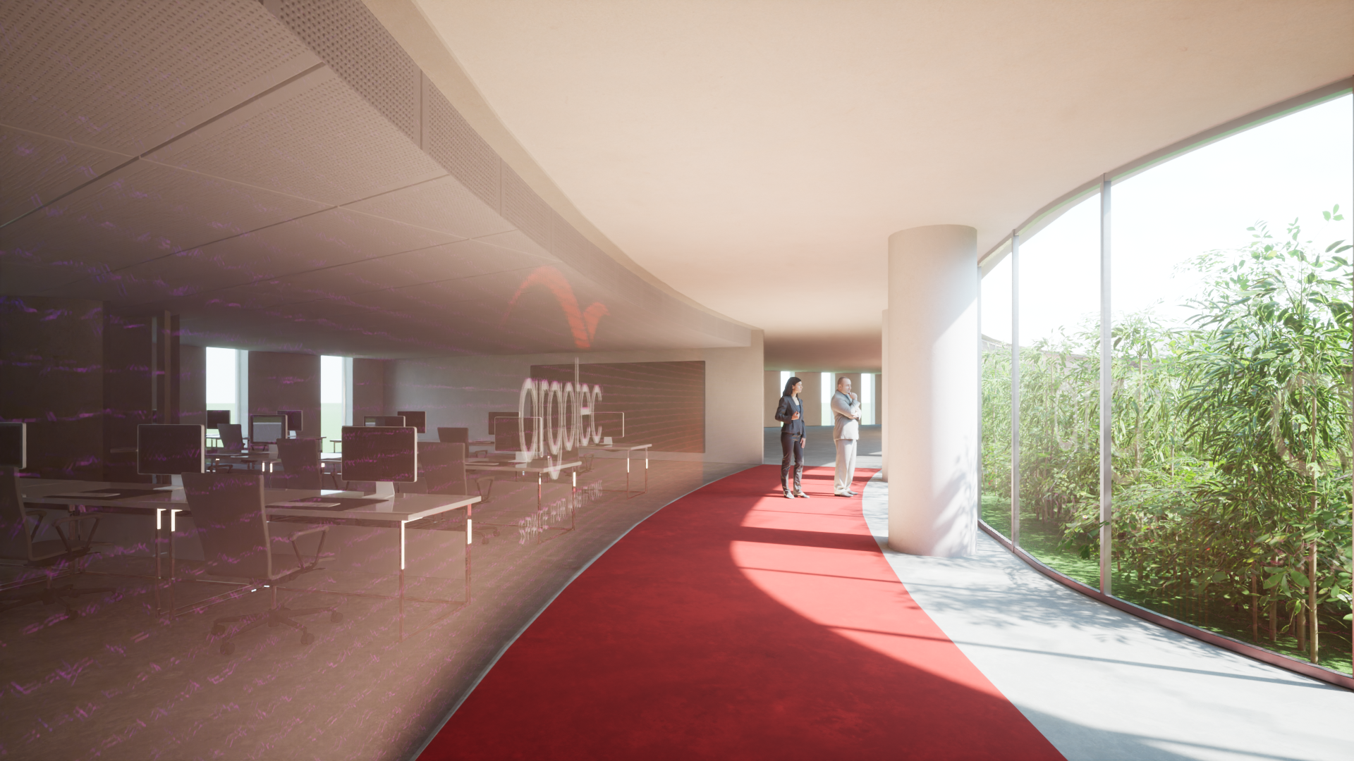 Il disegno del contesto parte dalle forme organiche e curve dell’opera e si apre nel paesaggio disegnando una nuova viabilità di accesso, uno spazio per la comunicazione e l’incontro – una cavea all’aperto – e gli spazi per le energie rinnovabili. Il verde è protagonista chiave nella nostra progettazione, è controcanto dell’edificio-scultura.